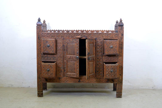 Antica Credenza afgana con intarsio legno massello di cedro 2 ante e 4 cassetti
