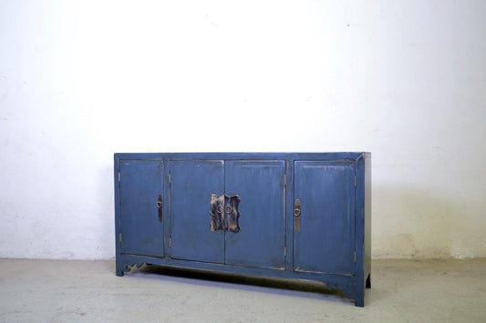 Credenza cinese in legno massello lacca blu grigio maniglie in ottone 4 ante