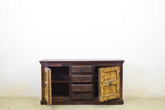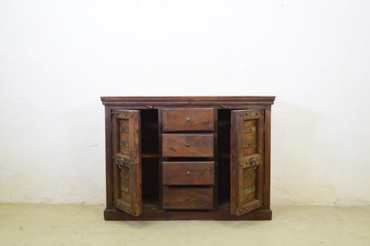 Credenza etnica indiana porte vecchie in legno massello bassa 2 ante 4 cassetti