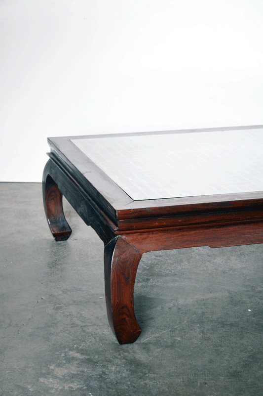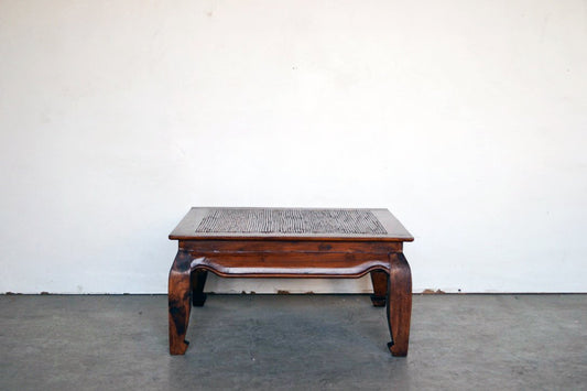 Tavolo oppio basso quadrato in legno massello di Olmo e piano con griglia in legno con cristallo