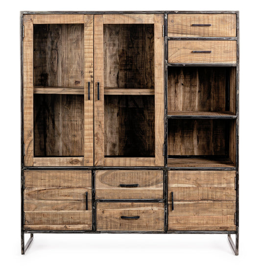 Credenza vetrina industrial in legno con struttura in ferro frontali ferro legno cemento 4 ante 2 cassetti
