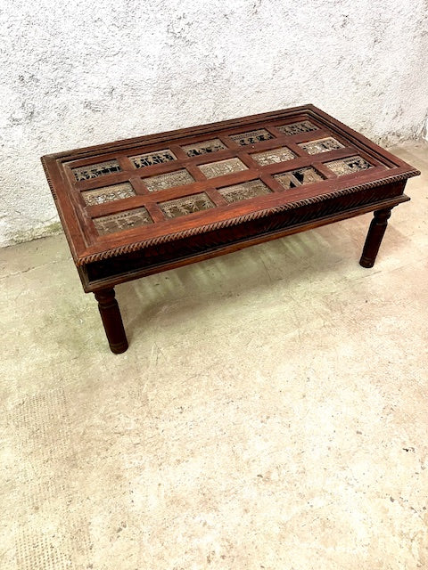 Tavolino indiano in Teak con fregio intarsiato e vetri dipinti