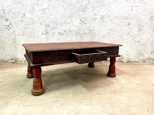 Tavolino etnico intarsiato con cassetto gambe rosse