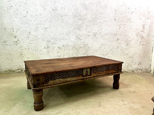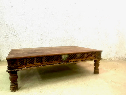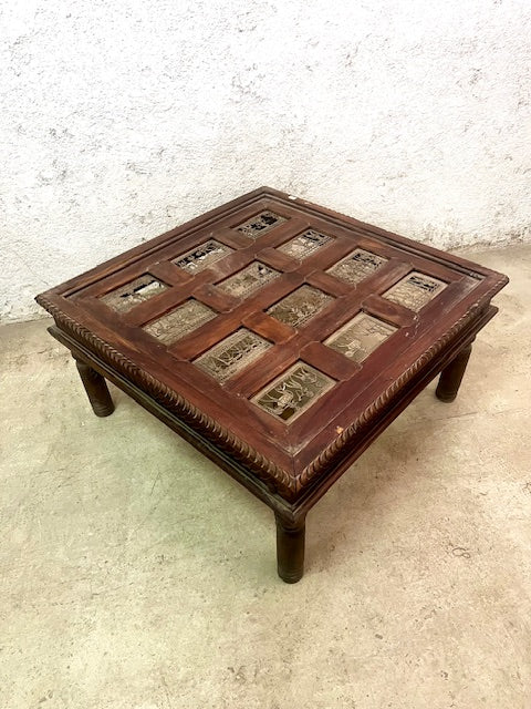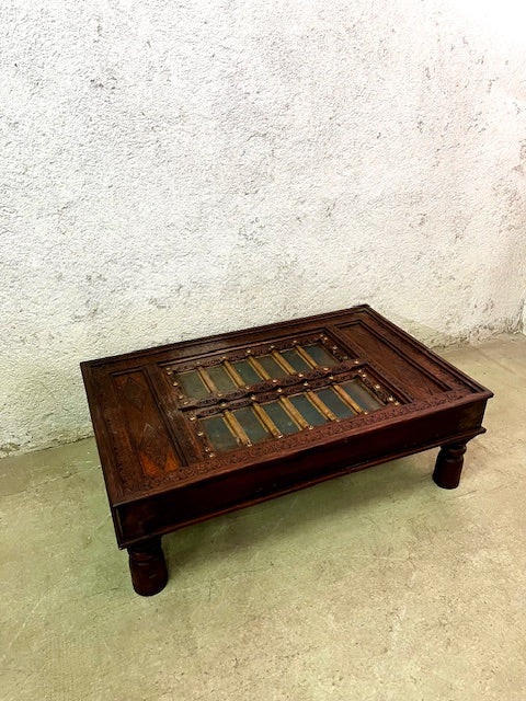 Tavolino etnico indiano con cristallo vecchia porta legno ferro ottone