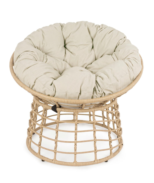 Poltrona ovale per esterni con intreccio in fibra color naturale e cuscini
