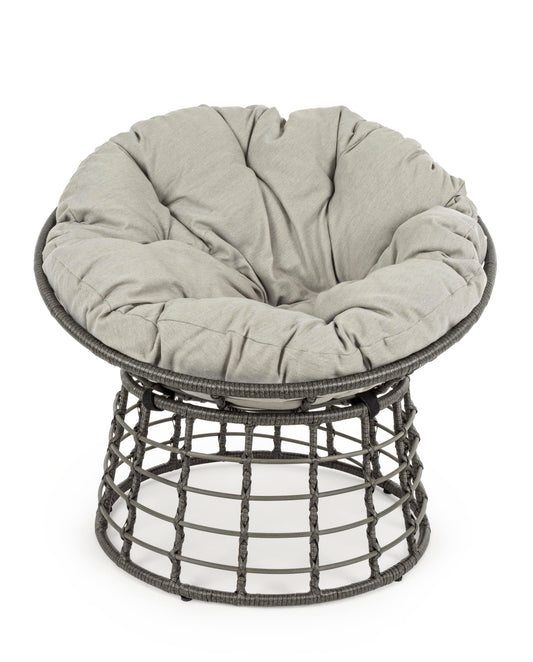 Poltrona ovale per esterni con intreccio in fibra color grigio e cuscini